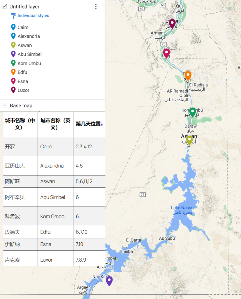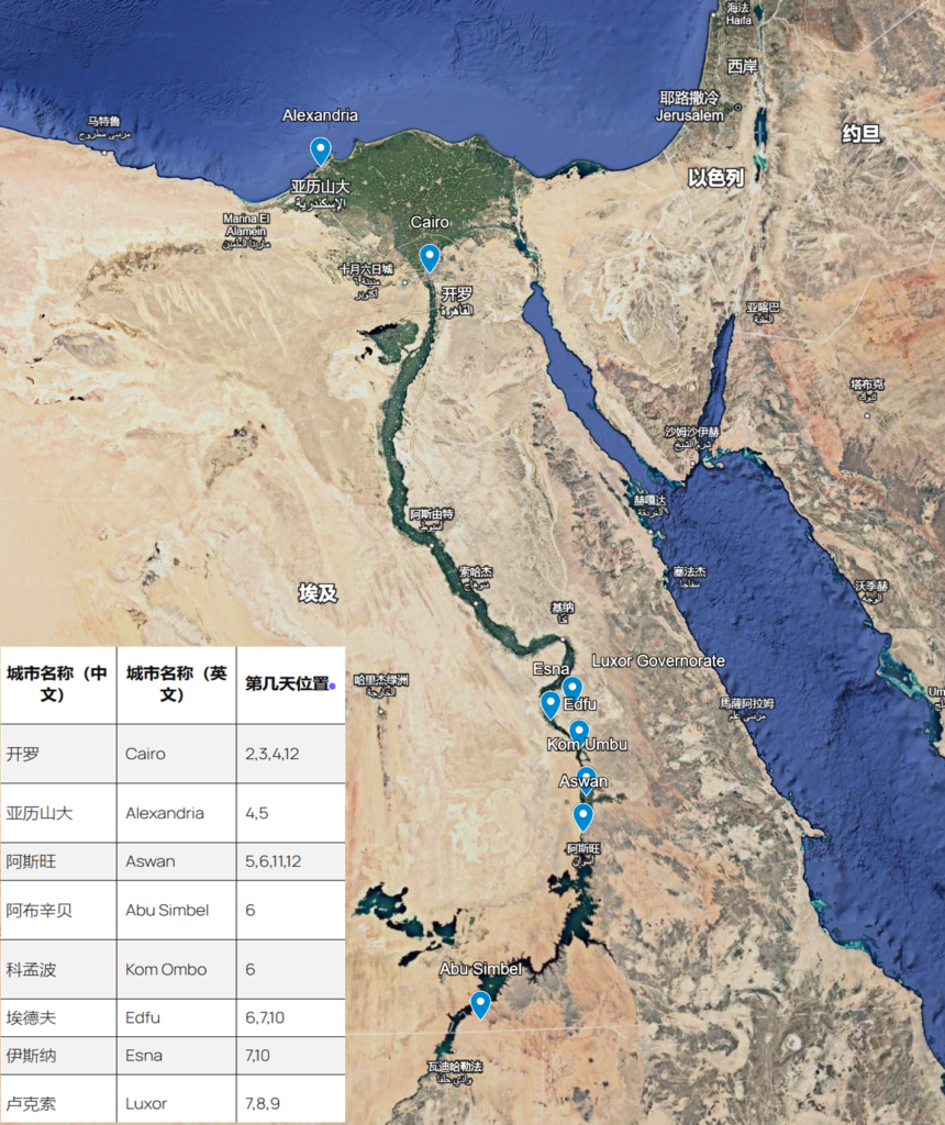 | 城市名称(中文) | 城市名称(英文) | 第几天位置 | 城市名称(埃及文/阿拉伯文) |